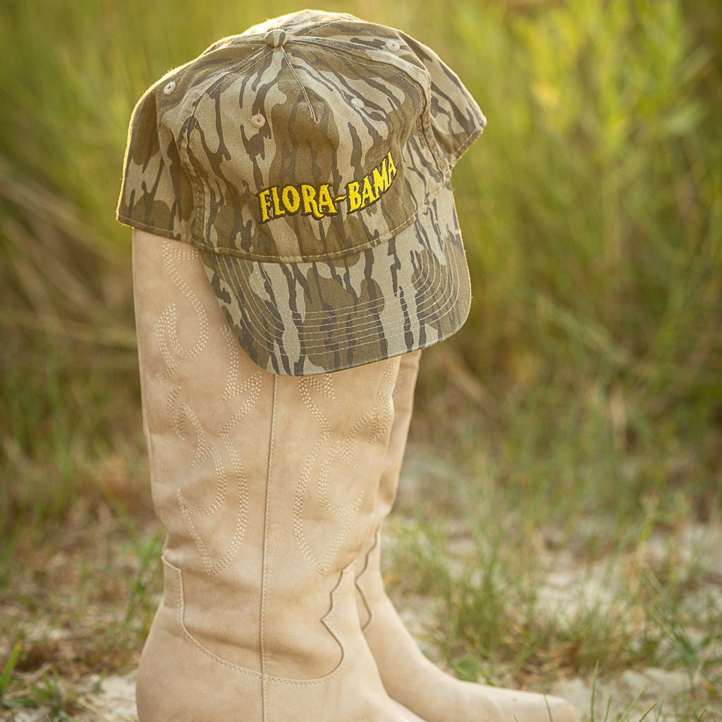 Introducing a collaboration between two iconic brands: The Flora-Bama and Vintage Mossy Oak, featuring the Original Bottomland camo design. The Vintage Dad Cap is the latest addition to our headwear collection, showcasing OG Bottomland in a classic dad cap fit.